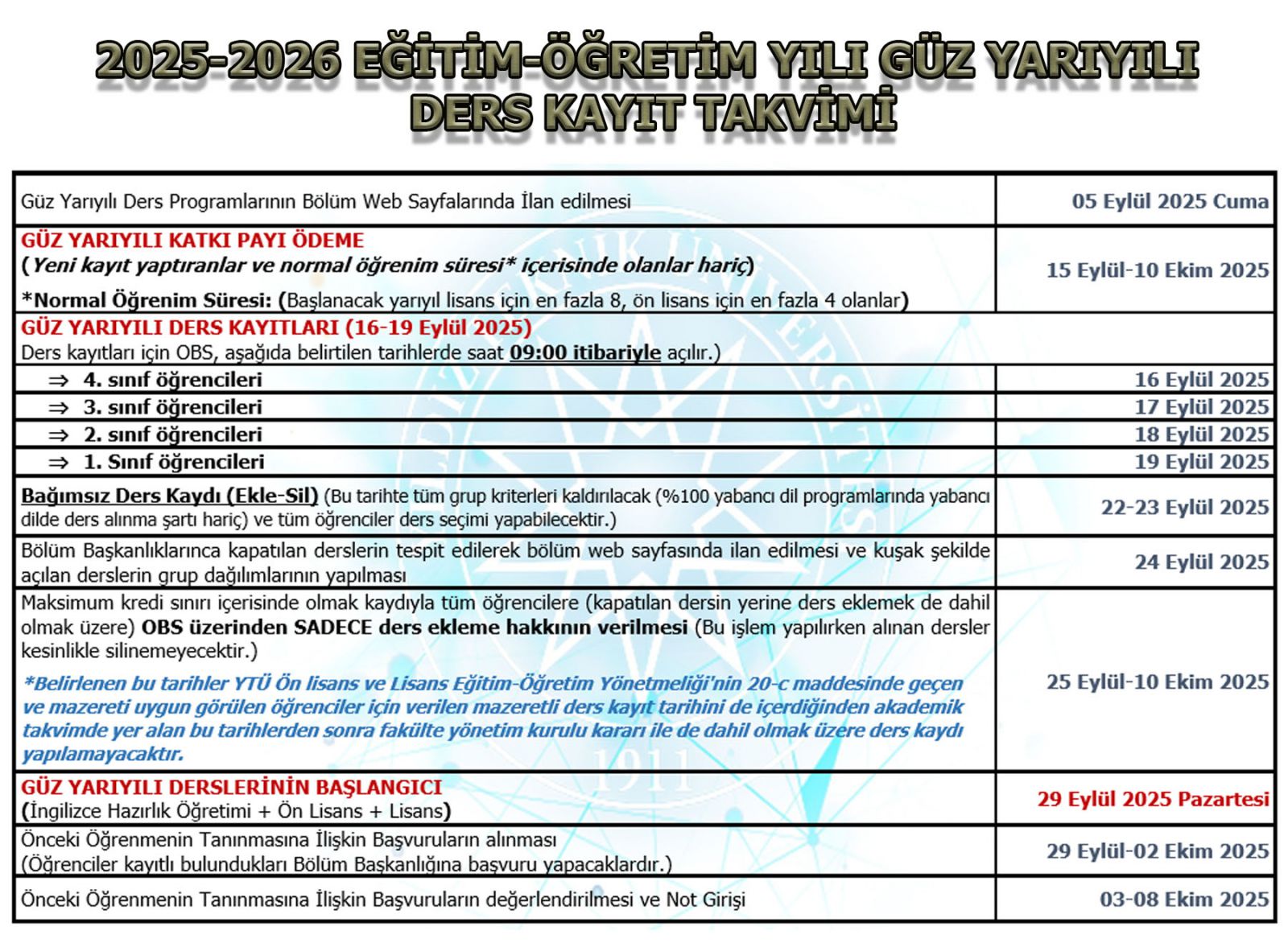 2025-2026 Eğitim-Öğretim yılı Güz yarıyılı ders kayıt işlemleri 16-19 Eylül 2025 tarihlerinde gerçekleştirilecektir. Ders kayıt takvimi ve Ders Kayıt Kılavuzları sayfada belirtilmiş olup, YTÜ Lisans Akademik Takvimi için buraya tıklayınız.